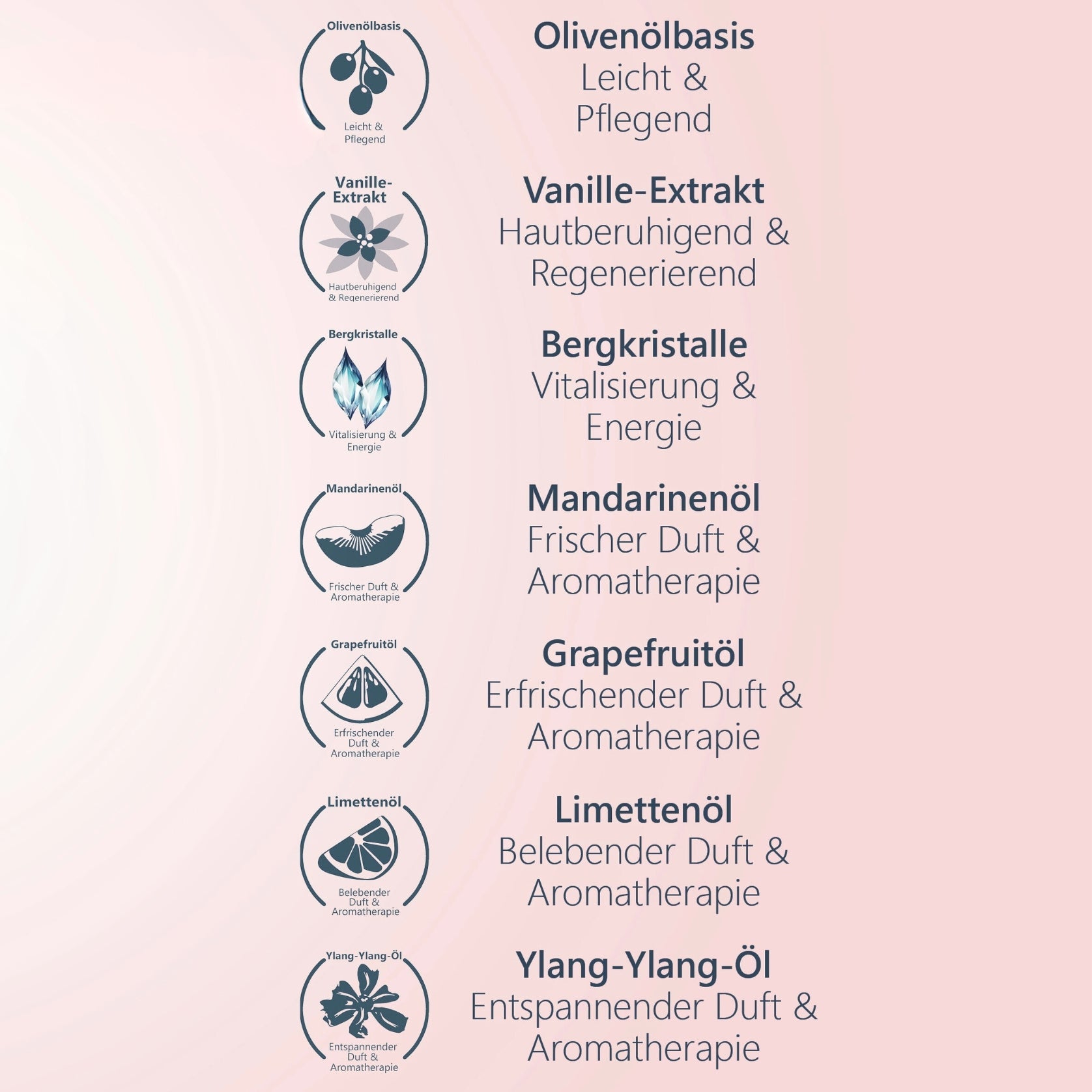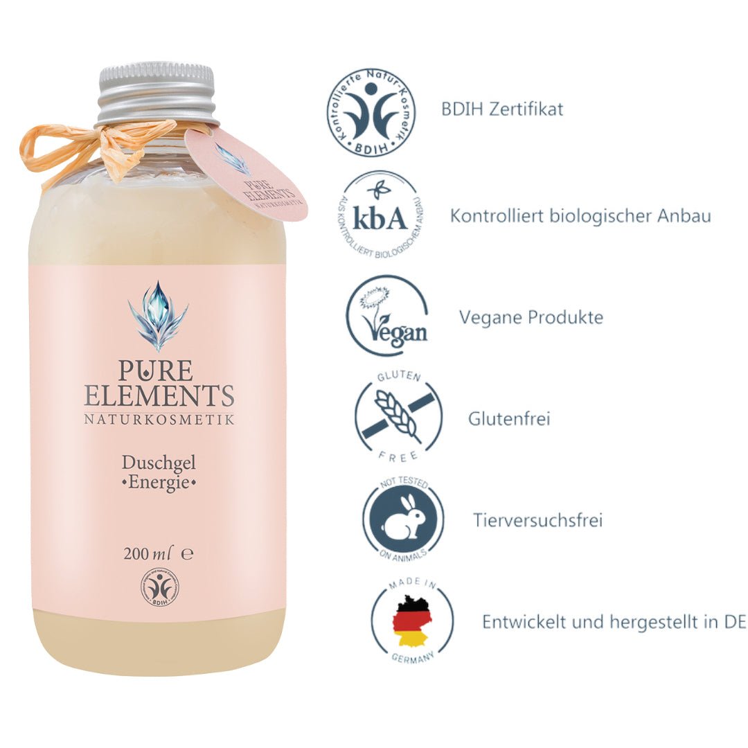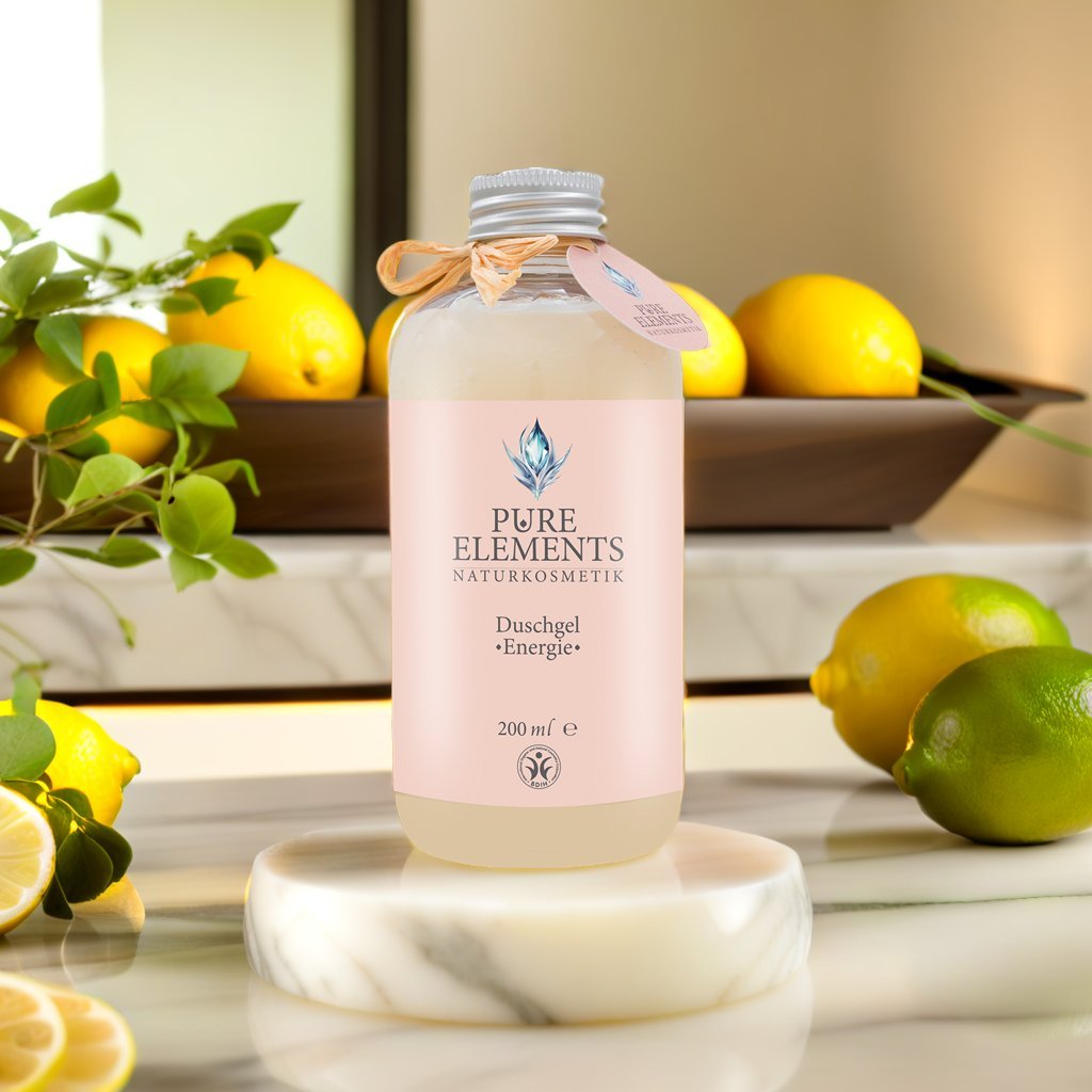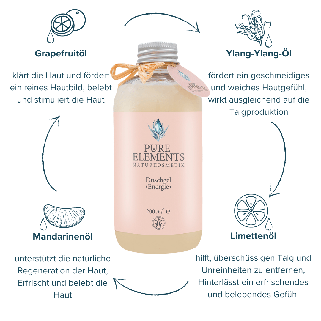 Duschgel Energie auf weißem Hintergrund mit Logos zu Grapefruitöl, Ylang-Ylang-Öl, Mandarinenöl und Limettenöl – erfrischend, belebend.
