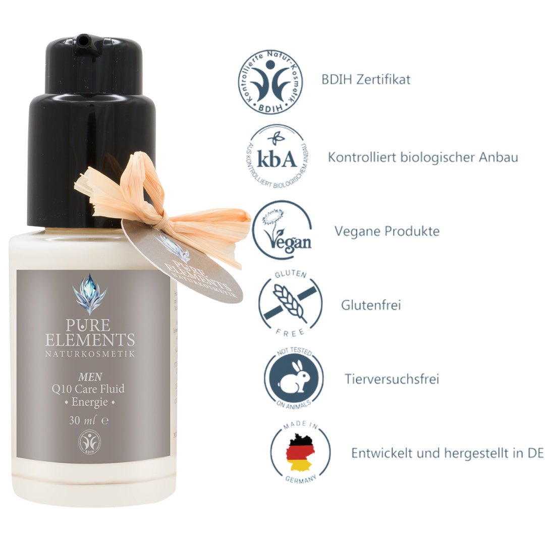 MEN Q10 Care Fluid auf weißem Hintergrund mit Q10-Liposomen, Vitamin E, Mandelöl und Sheabutter – straffend, schützend, pflegend.